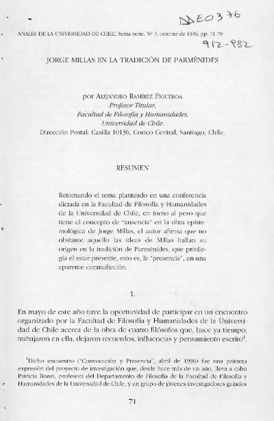 Jorge Millas en la tradición de Parménides [artículo] Alejandro Ramírez Figueroa.