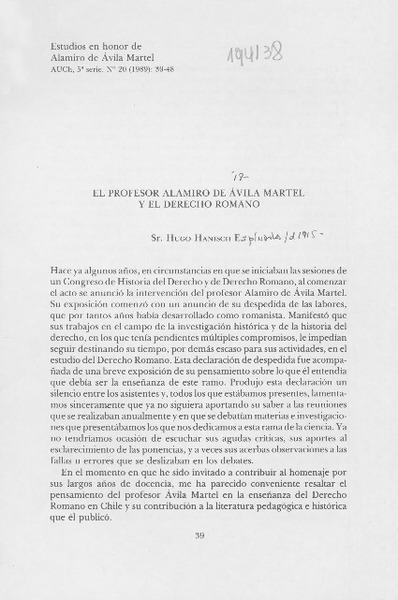 El profesor Alamiro Avila Martel y el derecho romano [artículo] Hugo Hanisch E.