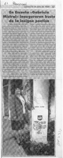 En escuela "Gabriela Mistral" inauguraron busto de la insigne poetisa [artículo].