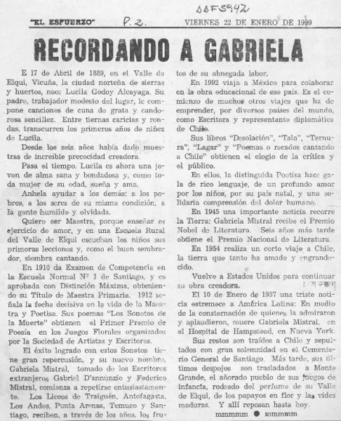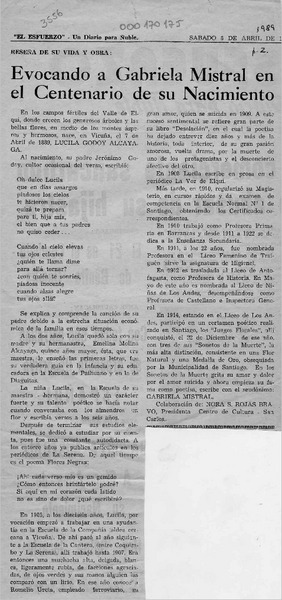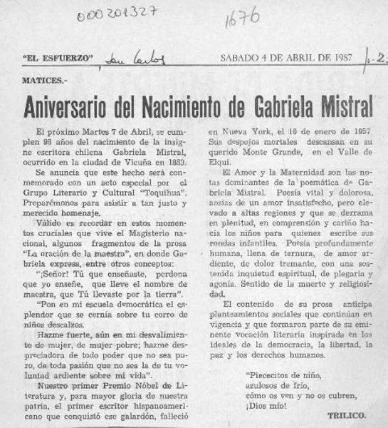 Aniversario del nacimiento de Gabriela Mistral [artículo] Trilico.