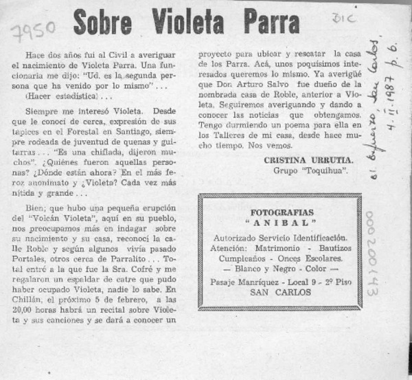 Preocupación por casa de Violeta [artículo] Termutes Henríquez Toledo.
