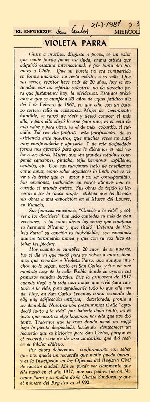 Siguen defendiendo nacimiento de Violeta Parra [artículo] Remberto Fuentes Venegas.