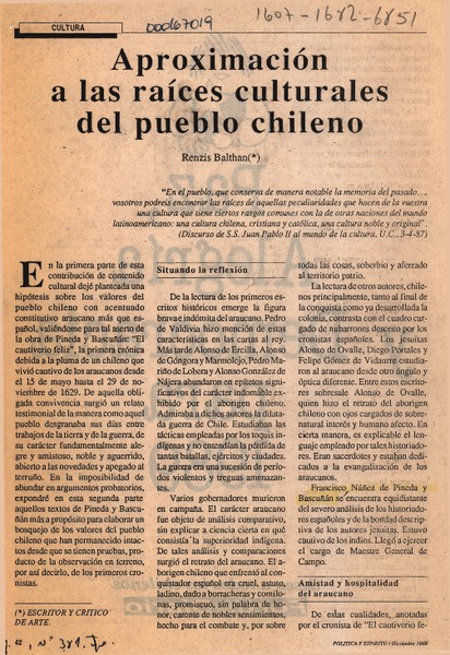 Aproximación a las raíces culturales del pueblo chileno [artículo] Renzis Balthan.