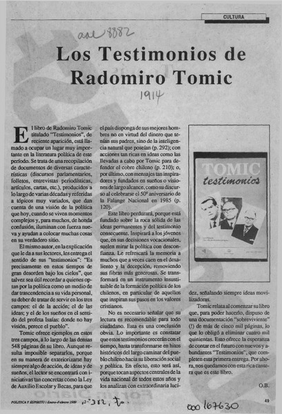 Los Testimonios de Radomiro Tomic [artículo] O. B.