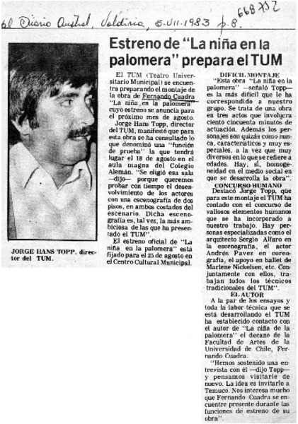 Estreno de "La niña en la palomera" prepara el TUM. [artículo]
