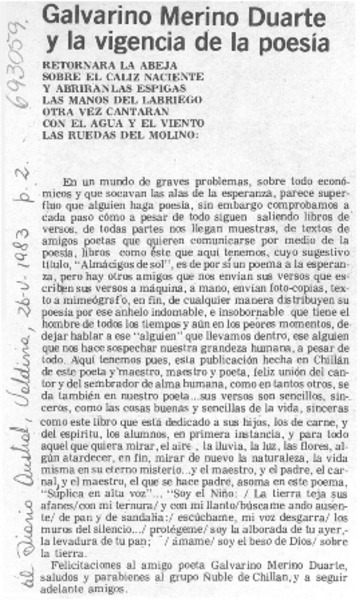 Galvarino Merino Duarte y la vigencia de la poesía. [artículo]