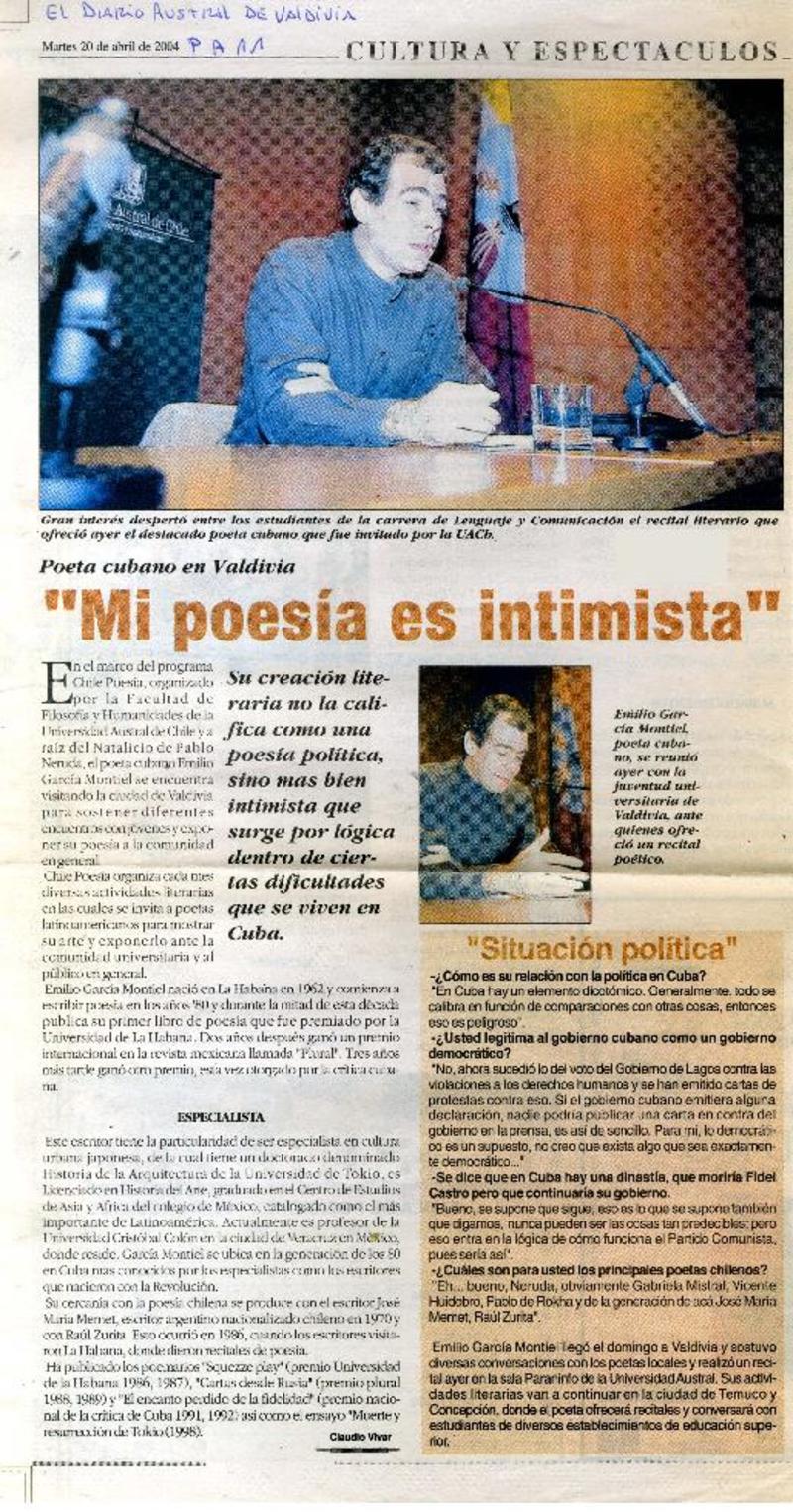 Mi poesía es intimista" [artículo] CLaudio Vivar.