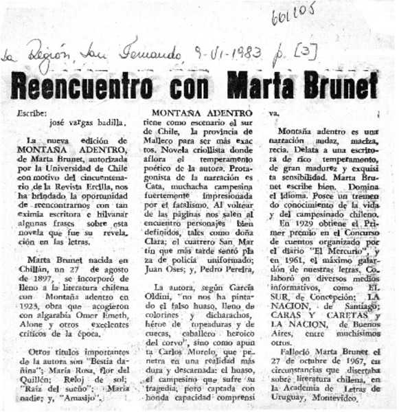 Reencuentro con Marta Brunet [artículo] José Vargas Badilla.