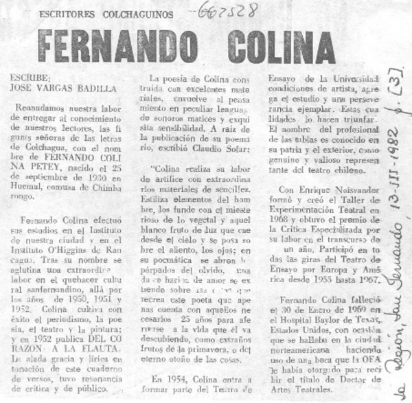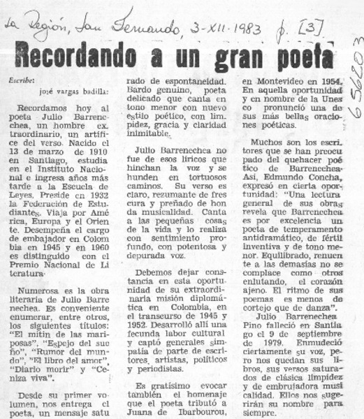 Recordando a un gran poeta. [artículo] José Vargas Badilla.