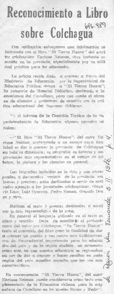 Reconocimiento a libro sobre Colchagua. [artículo]