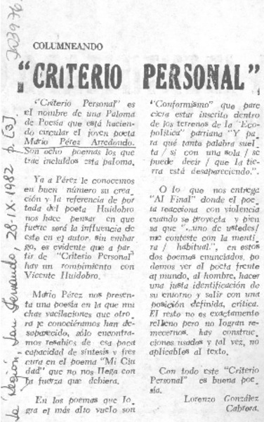 Criterio personal [artículo] Lorenzo González Cabrera.
