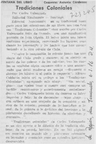 Tradiciones coloniales [artículo] Antonio Cárdenas.