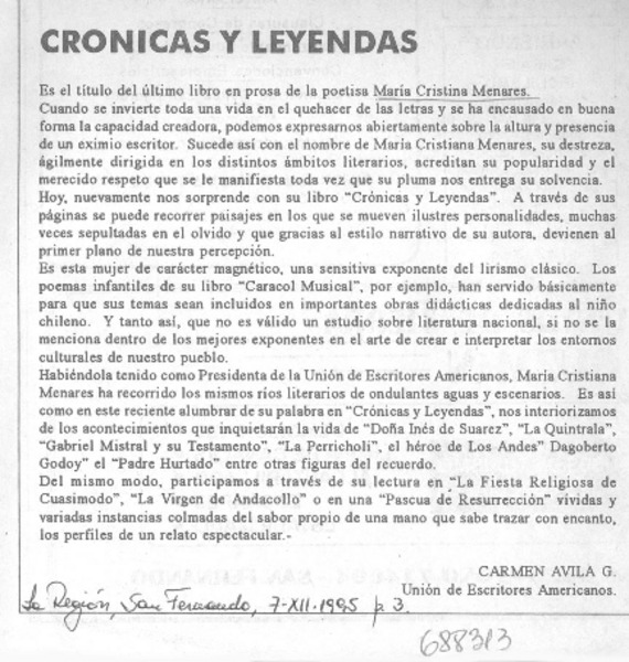 Crónicas y leyendas [artículo] Carmen Avila G.