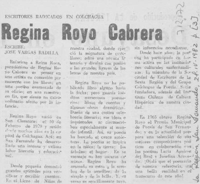 Regina Royo Cabrera [artículo] José Vargas Badilla.