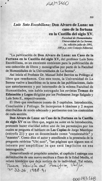 Luis Soto Escobillana, "Don Alvaro de Luna, un caso de la fortuna en la Castilla del siglo XV" [artículo] S. Liliana Vera Urarte.