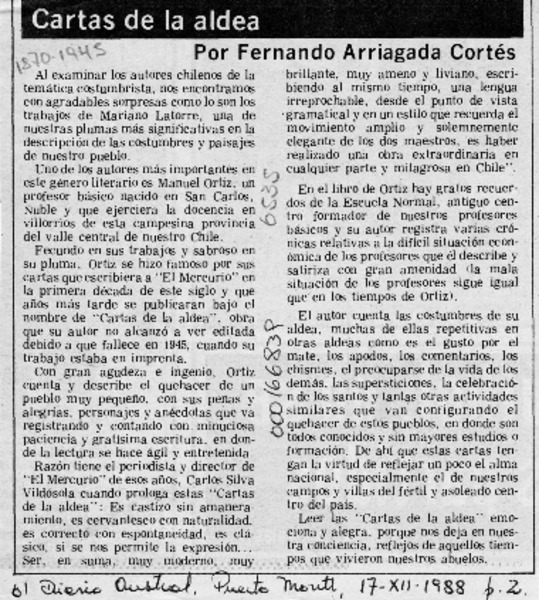 Cartas de la aldea [artículo] Fernando Arriagada Cortés.