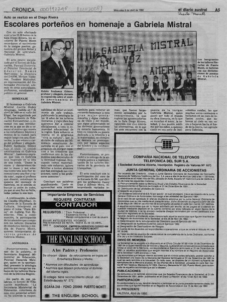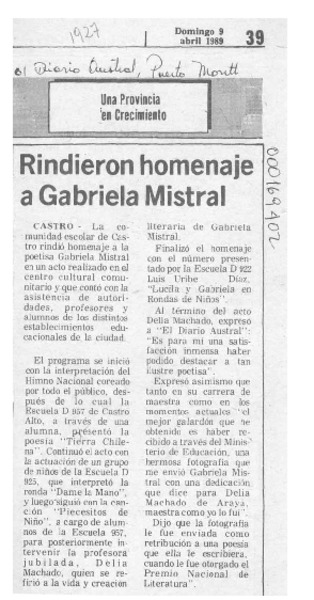 Rindieron homenaje a Gabriela Mistral [artículo].