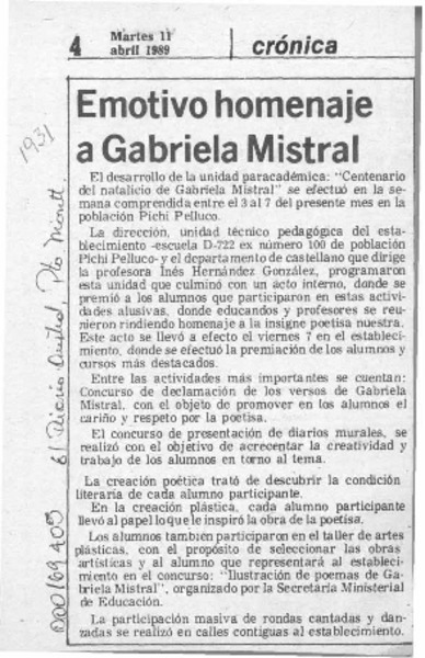 Emotivo homenaje a Gabriela Mistral [artículo].