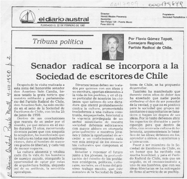 Senador radical se incorpora a la Sociedad de Escritores de Chile [artículo] Flavio Gómez Tepott.