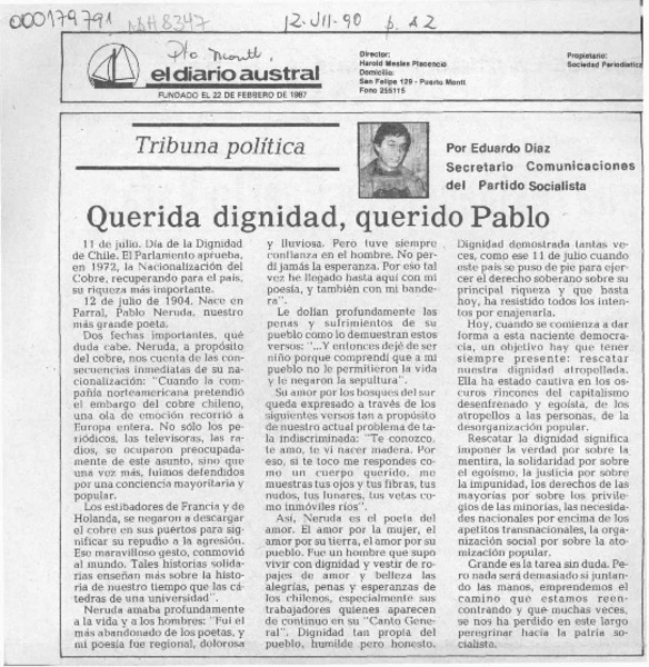 Querida dignidad, querido Pablo [artículo] Eduardo Díaz.