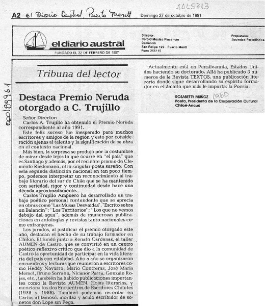 Destaca premio Neruda otorgado a C. Trujillo [artículo] Rosabetty, Muñoz.