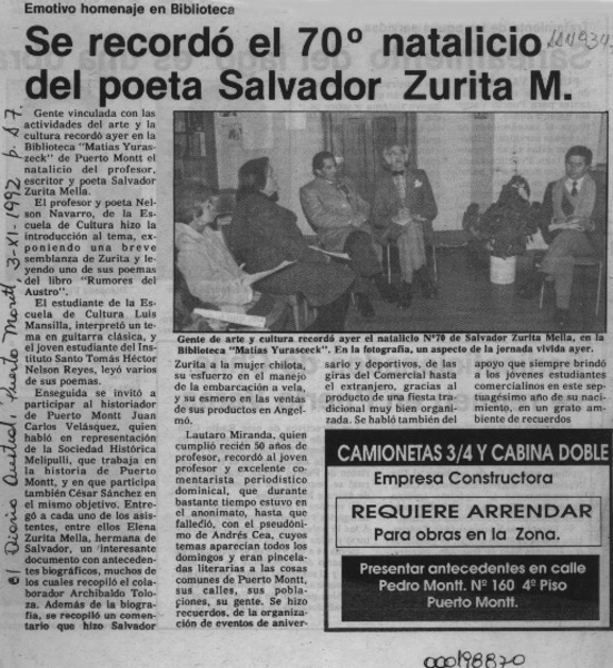 Emotivo homenaje a la memoria del poeta Salvador Zurita Mella [artículo].