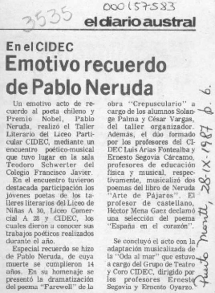 Emotivo recuerdo de Pablo Neruda [artículo].