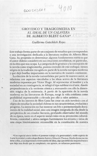 Grotesco y tragicomedia en "El ideal de un calavera" de Alberto Blest Gana [artículo] Guillermo Gotschlich Reyes.