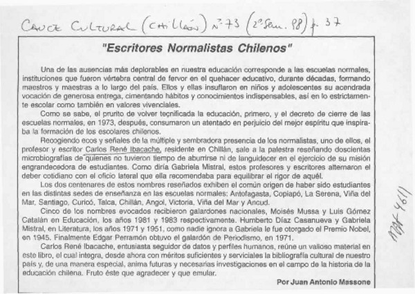 "Escritores normalistas chilenos" [artículo] Juan Antonio Massone.