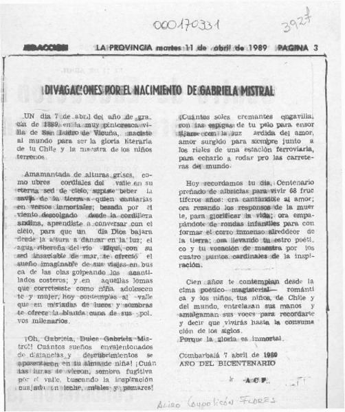 Divagaciones por el nacimiento de Gabriela Mistral [artículo] A. C. F.