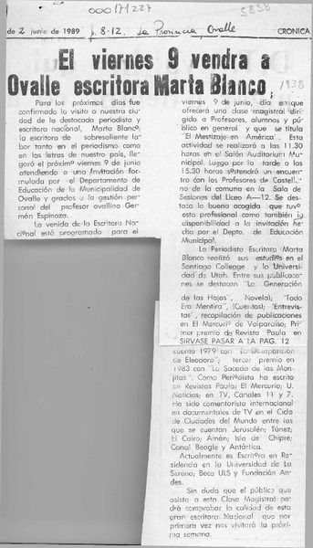 El Lunes 3 estará en Ovalle la escritora Marta Blanco [artículo].