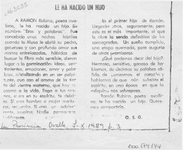 Ramón Rubina nace en el mes de la muerte de Neruda, septiembre [artículo].
