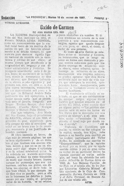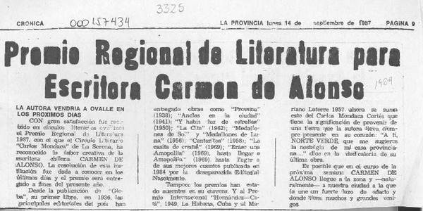 Premio Regional de Literatura para escritora Carmen de Alonso [artículo].