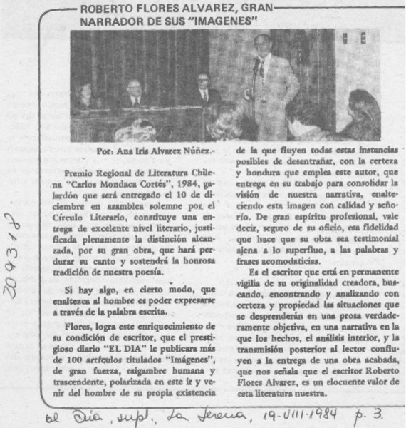 Roberto Flores Alvarez, gran narrador de sus "imágenes" [artículo] Ana Iris Alvarez Núñez.