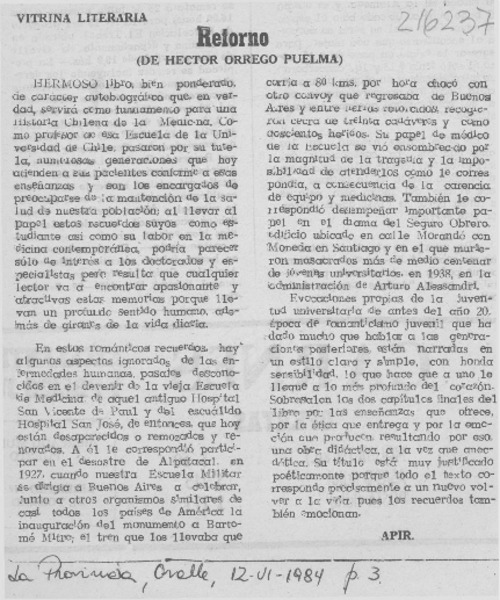 "Retorno" de Héctor Orrego Puelma [artículo] Apir.