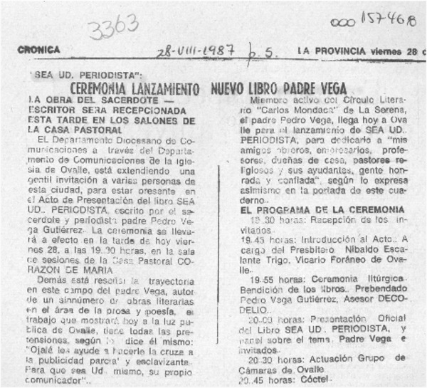 Ceremonia lanzamiento nuevo libro Padre Vega [artículo].
