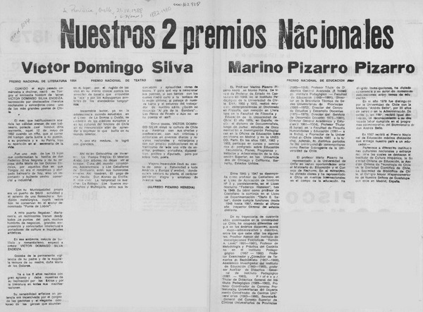 Nuestros 2 Premios Nacionales [artículo] Alfredo Pizarro Heredia.