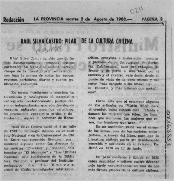 Raúl Silva Castro, pilar de la cultura chilena [artículo].