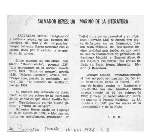 Salvador Reyes, un marino de la literatura [artículo] L. E. R.