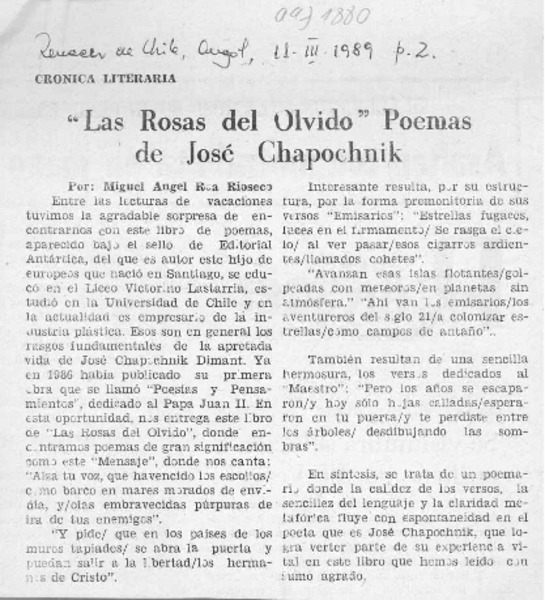 "Las rosas del olvido" poemas de José Chapochnik [artículo] Miguel Angel Roa Rioseco.