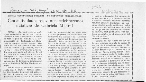 Con actividades relevantes celebraremos natalicio de Gabriela Mistral [artículo].