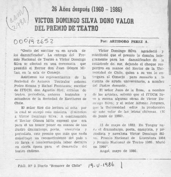 Víctor Domingo Silva donó valor del Premio de Teatro [artículo] Artidoro Pérez A.
