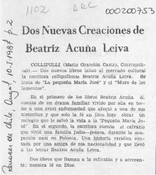 Dos nuevas creaciones de Beatriz Acuña Leiva [artículo] Mario Grandón Castro.