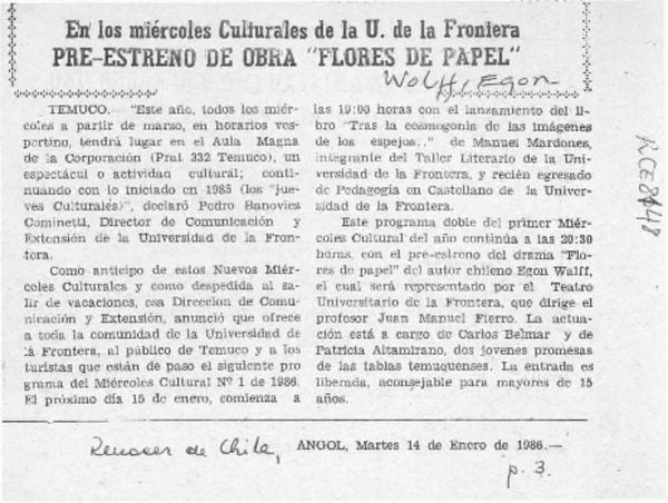 Poeta Raúl Zurita ofrecerá recital en Angol [artículo].