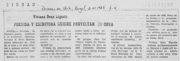 Poetisa y escritora quiere proyectar su obra [artículo].