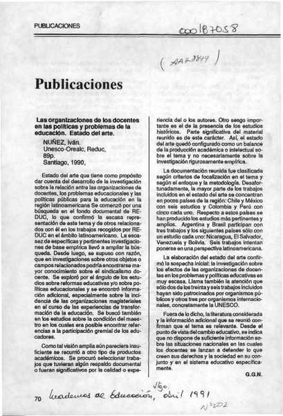 NUÑEZ P., IVAN - ORGANIZACIONES DE LOS DOCENTES EN LAS POLITICAS Y PROBLEMAS DE LA EDUCACION, LAS