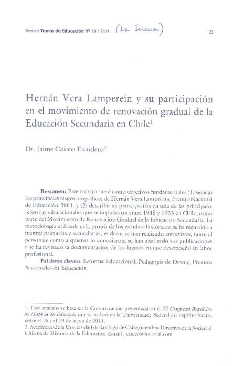 Hernán Vera Lamparein y su participación en el movimiento de renovación gradual de la educación secundaria en Chile [artículo] Jaime Caiceo Escudero.
