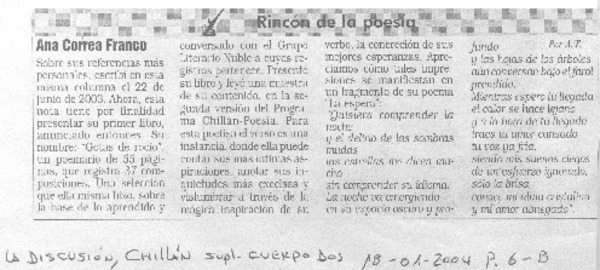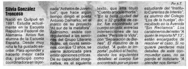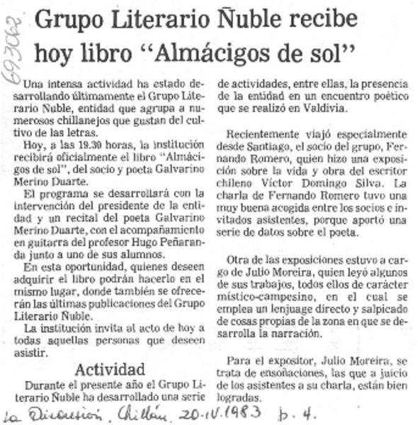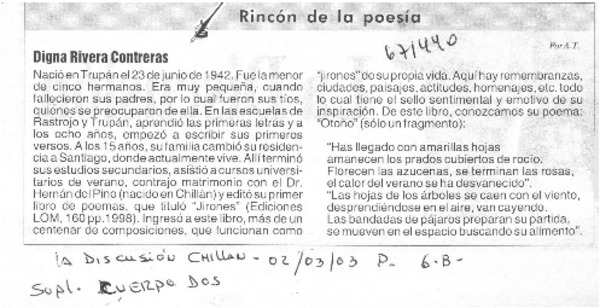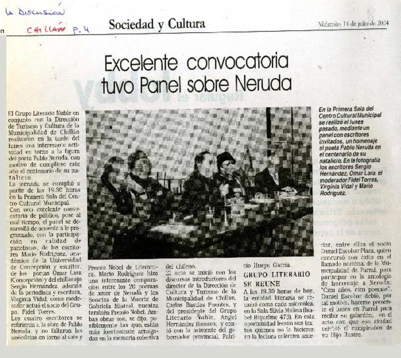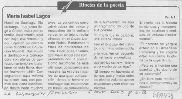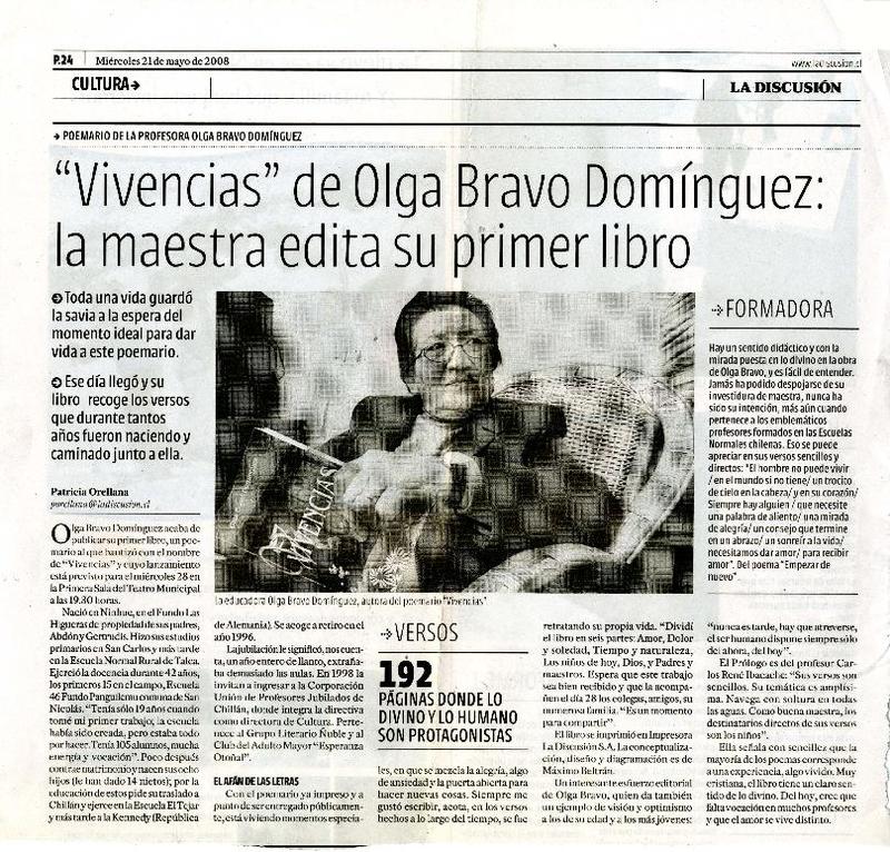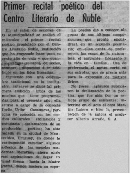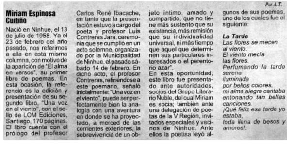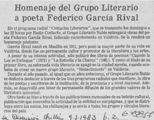 Un homenaje a poetisa premiada rendirá grupo literario de "Ñuble". [artículo]