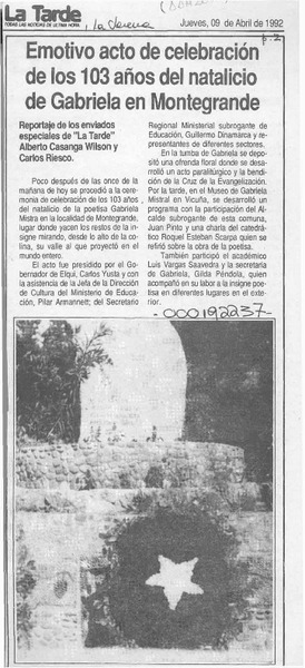 Emotivo acto de celebración de los 103 años del natalicio de Gabriela en Montegrande [artículo].