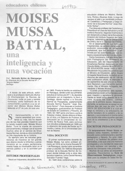 Moises Mussa Battal, una inteligencia y una vocación [artículo] Gertrudis Muñoz de Ebensperger.